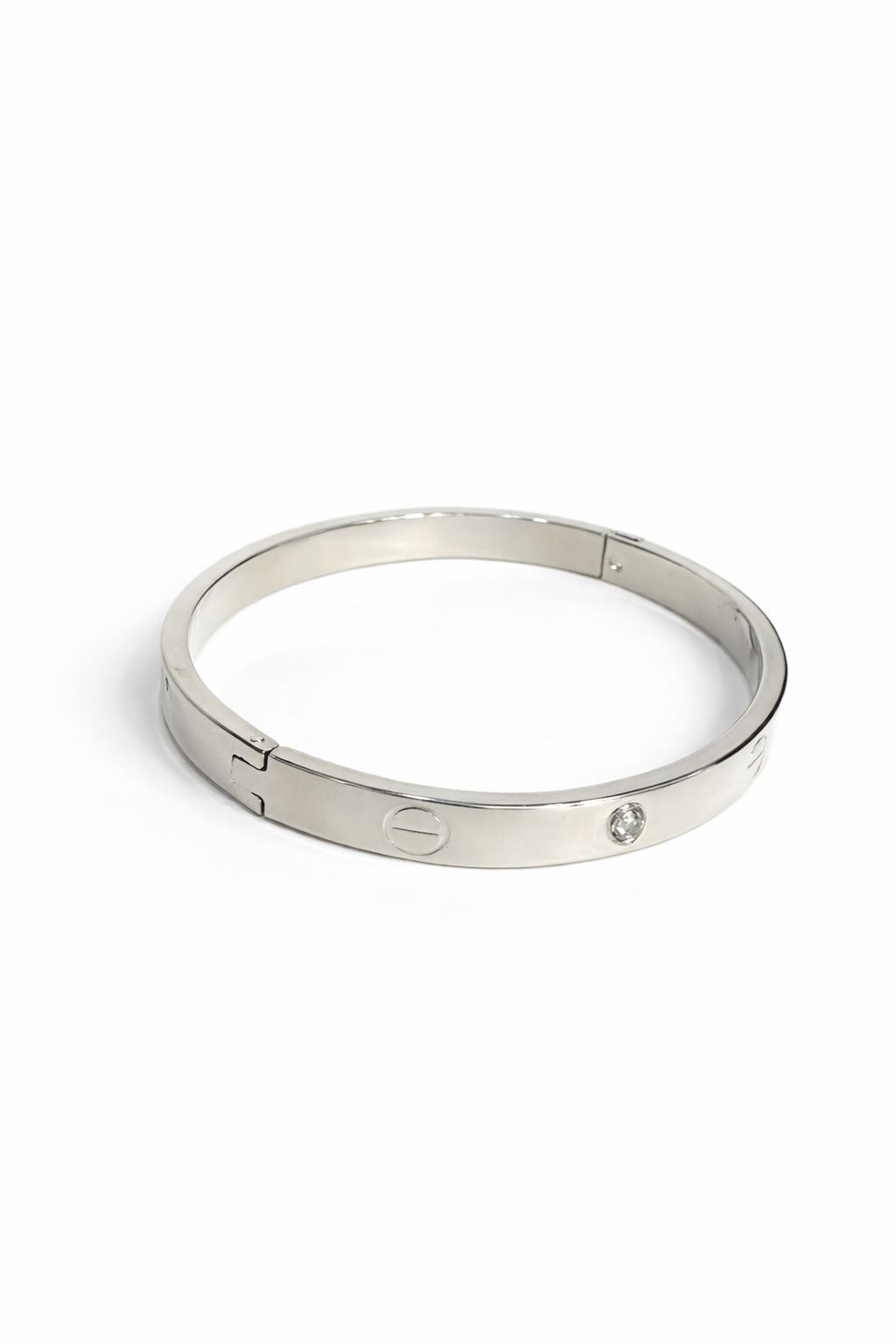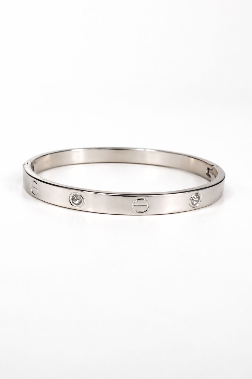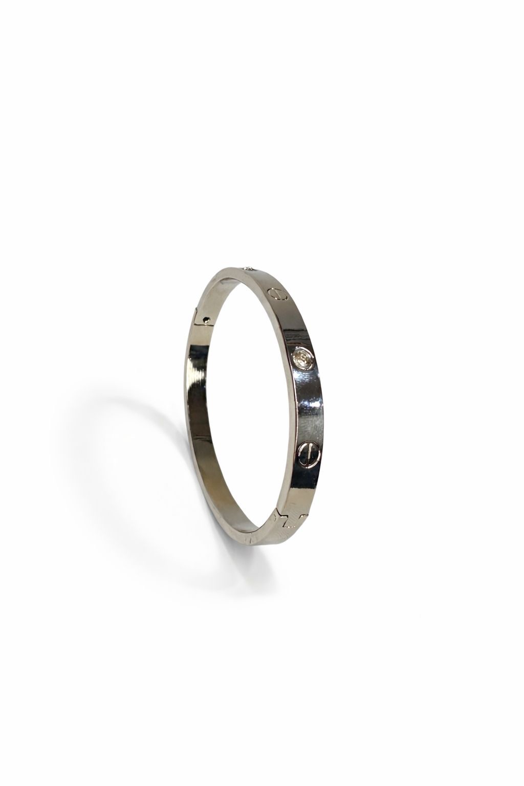 - Rigid metallic bangle with a silver-toned finish. Featuring a repeating circular engraving and inlaid contrast stones for a reflective effect. Integrated pressure clasp.