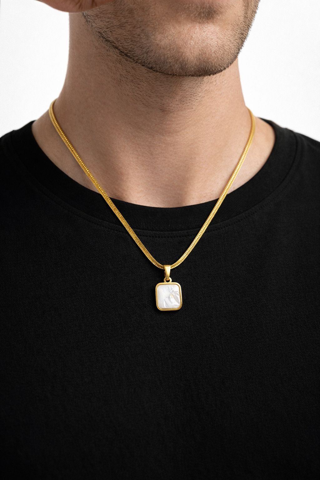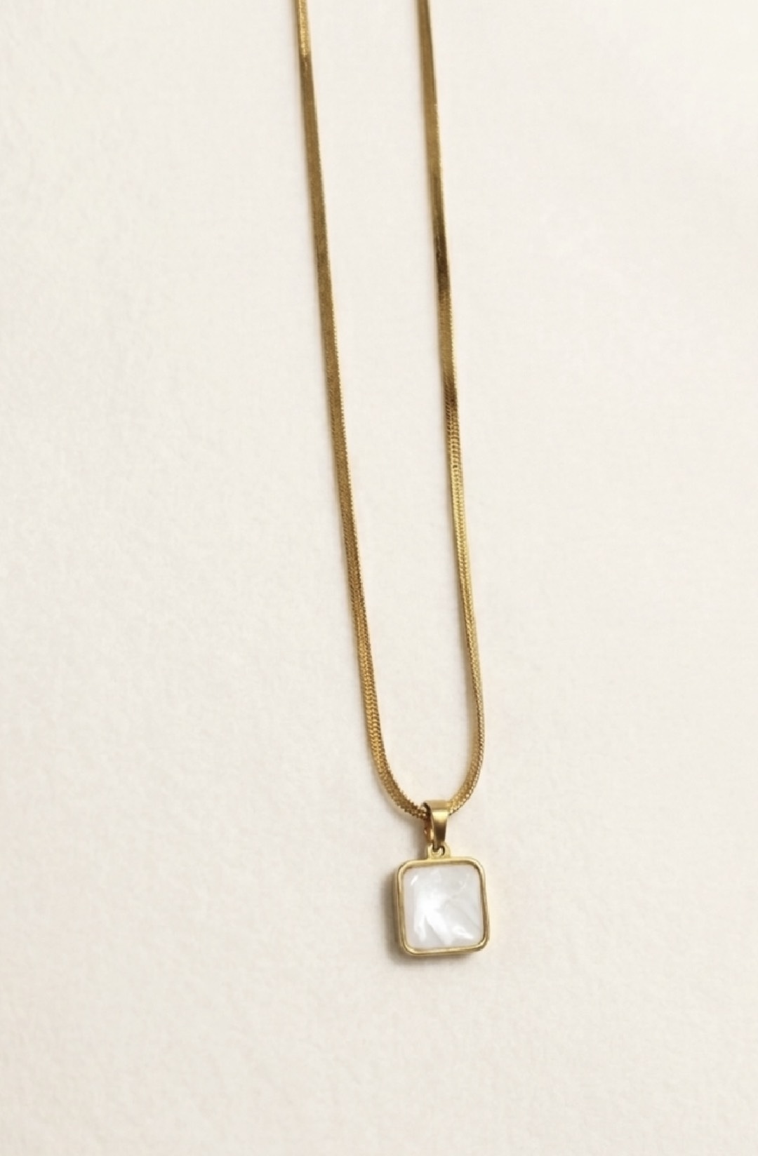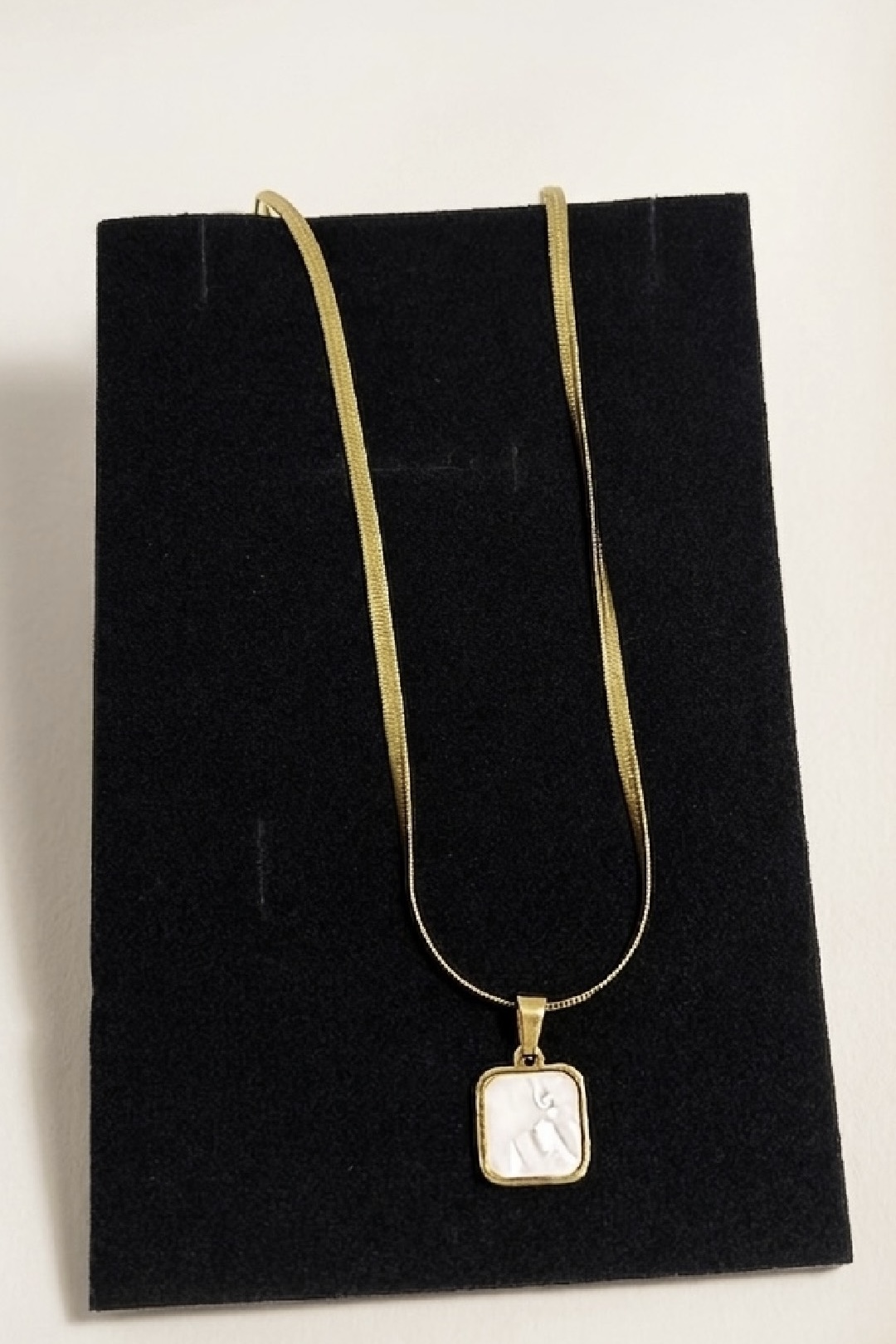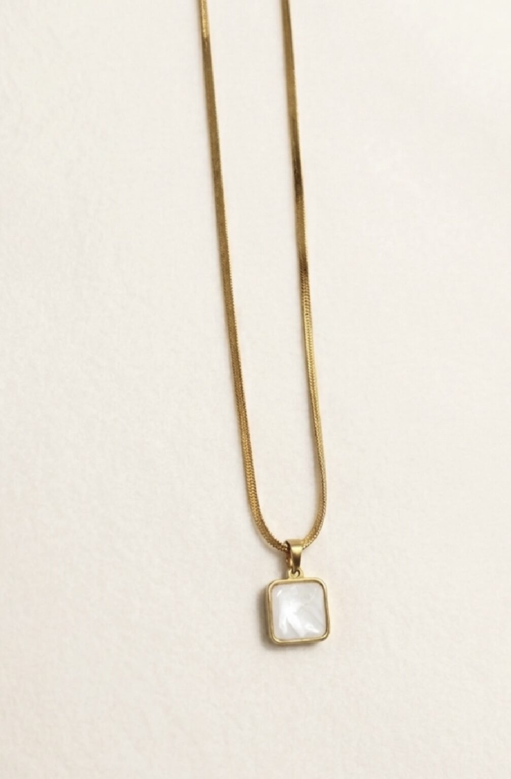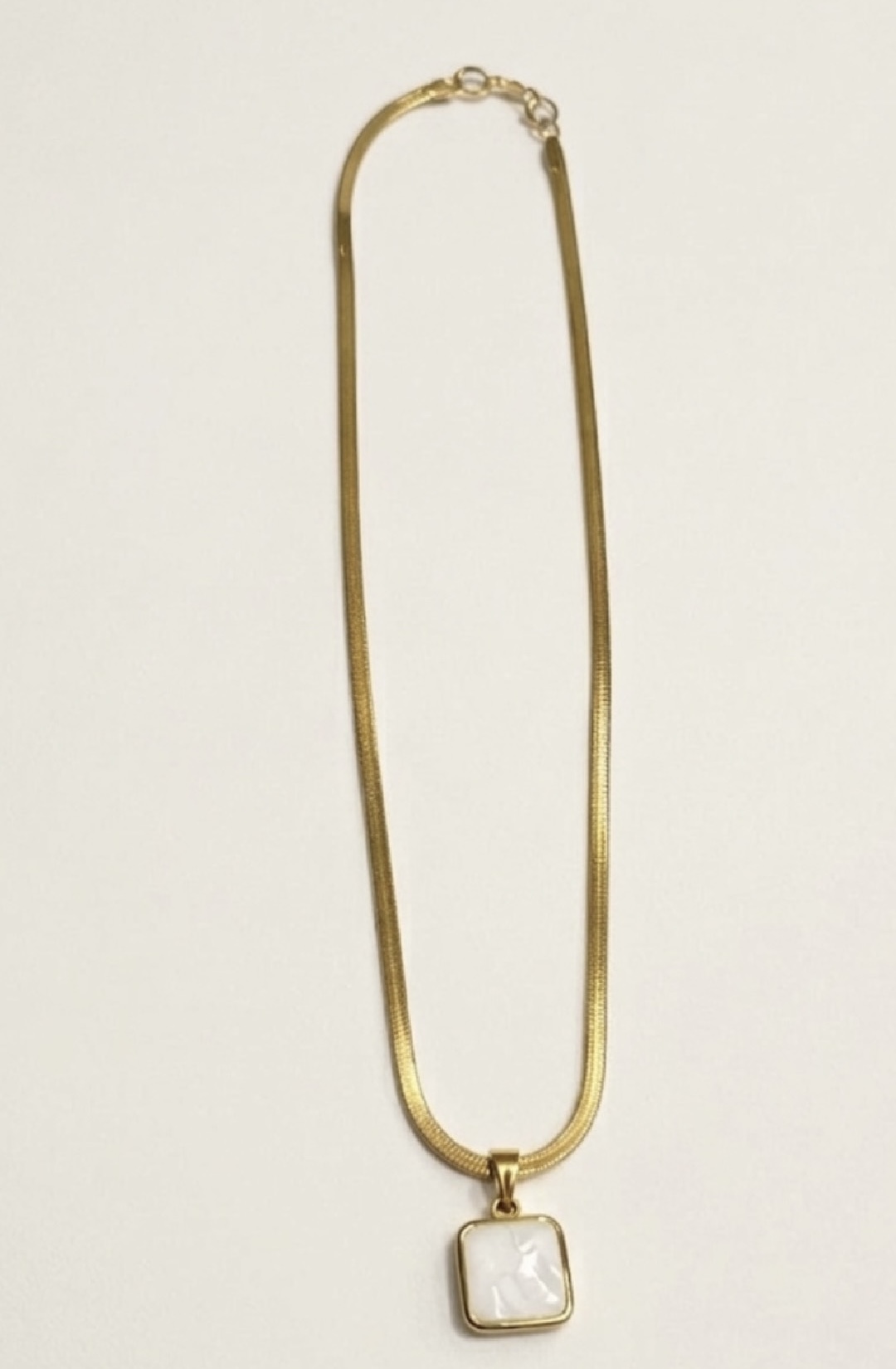- A study in modern minimalism.This gold-tone snake chain necklace is defined by its fluid silhouette and a sleek black square pendant that adds subtle contrast. Designed to sit effortlessly against the skin, the smooth chain reflects light with every movement, while the geometric pendant brings a refined edge. Worn alone or layered, it’s a timeless piece that elevates both everyday and evening looks.