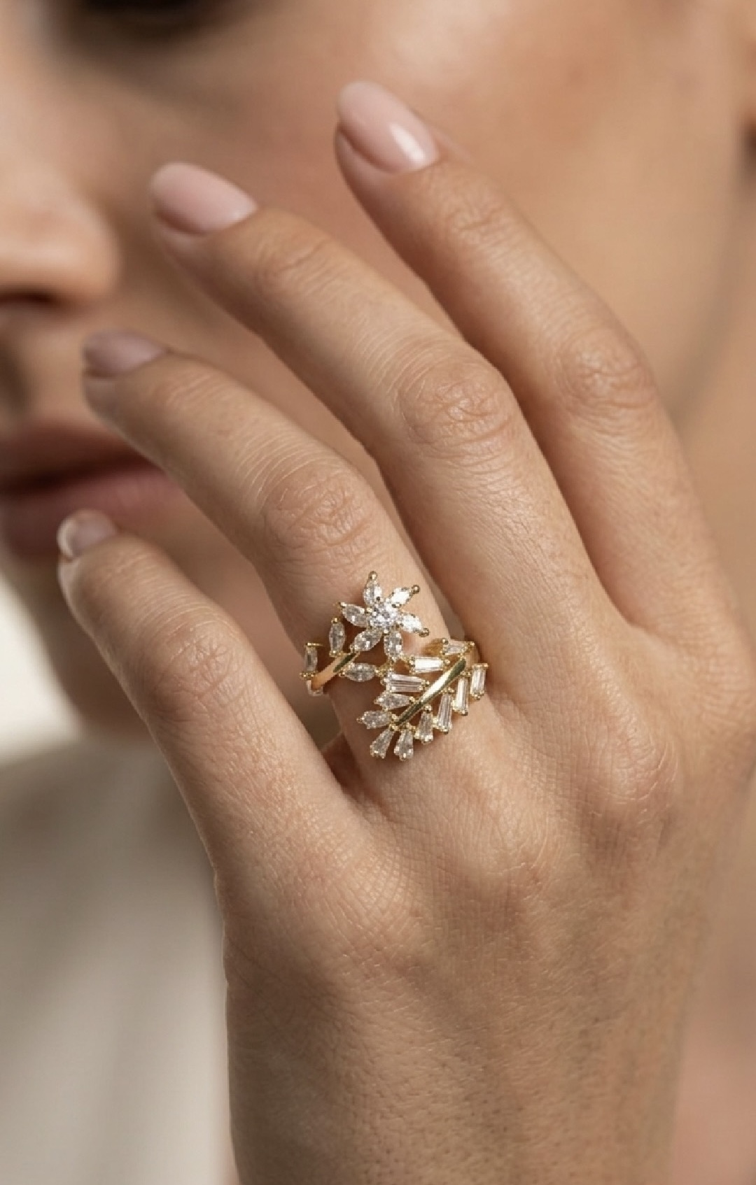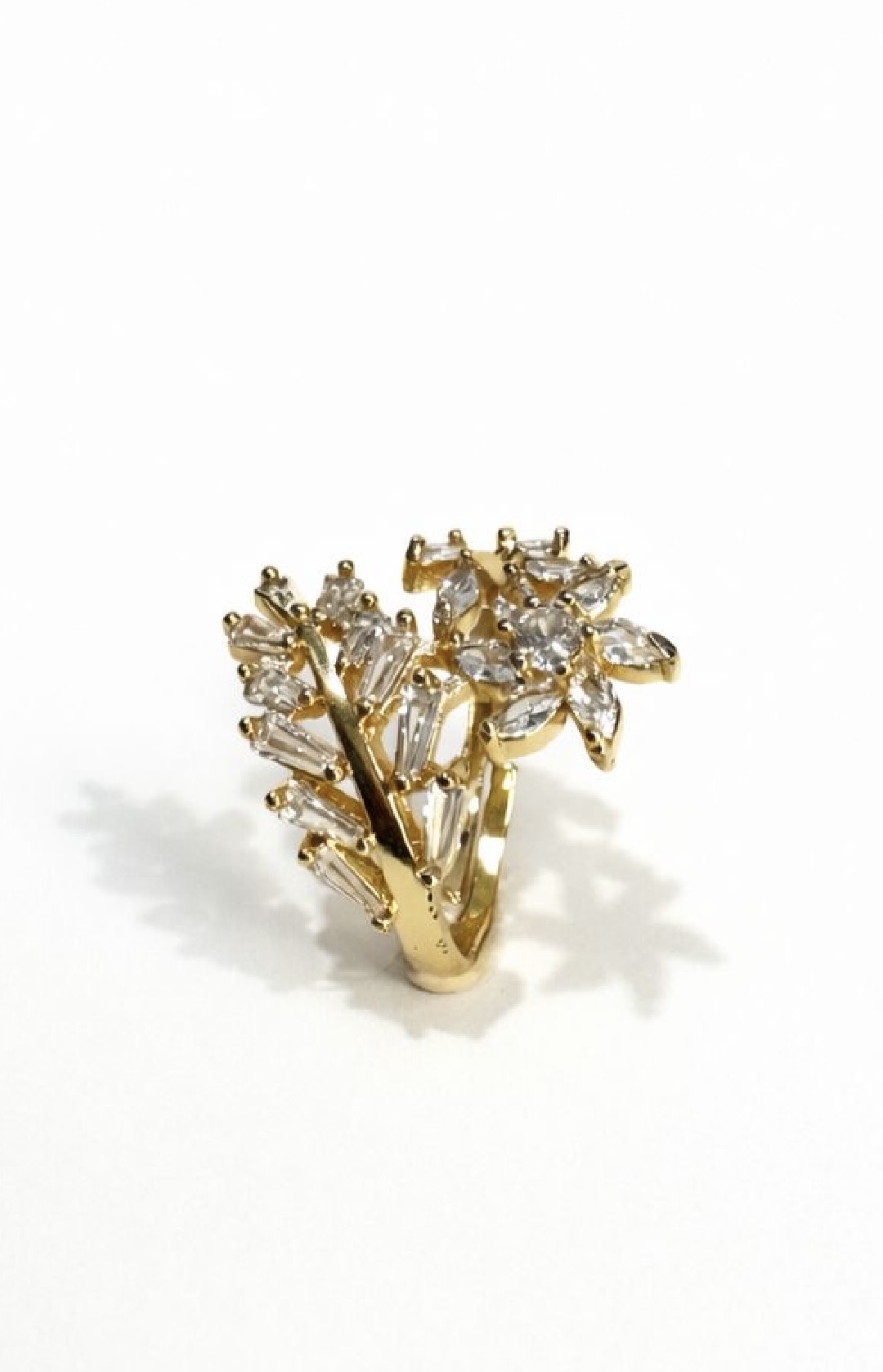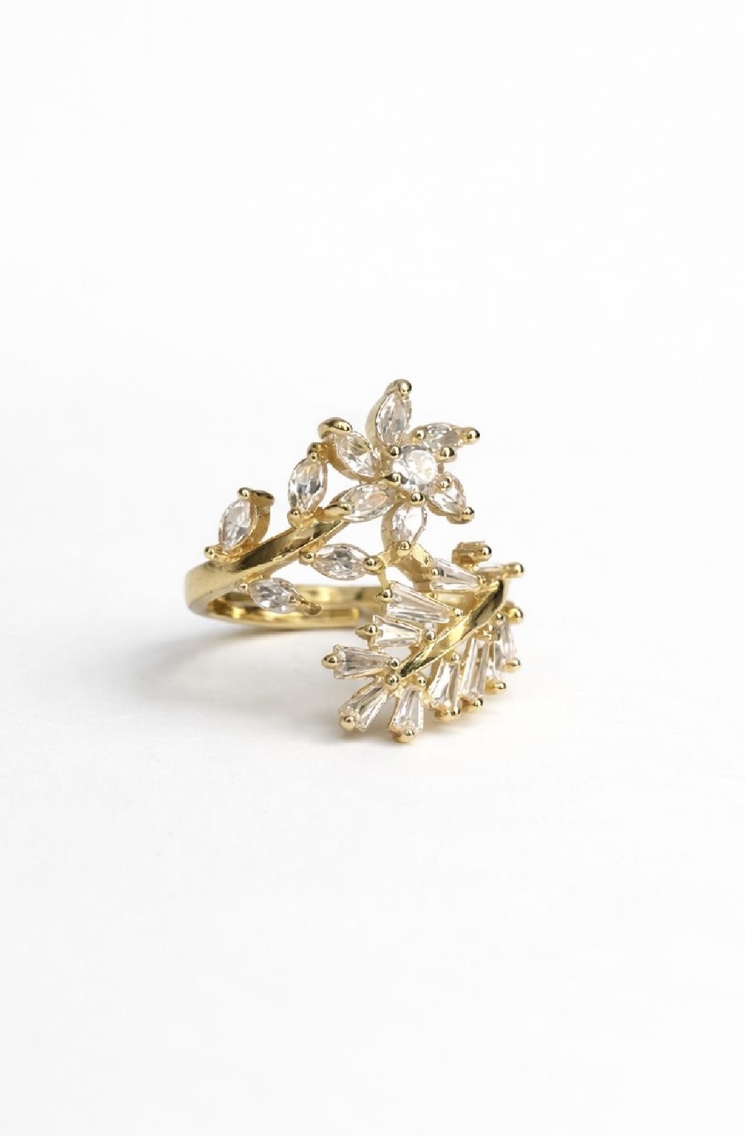 • Gold-finish ring featuring an intricate botanical wrap-around silhouette. This statement piece is defined by a central floral motif and cascading leaf-like structures. Each petal and leaf is meticulously set with marquise-cut glass crystals in a high-shine finish. The organic, fluid frame is designed with an adjustable open-back for a custom fit.