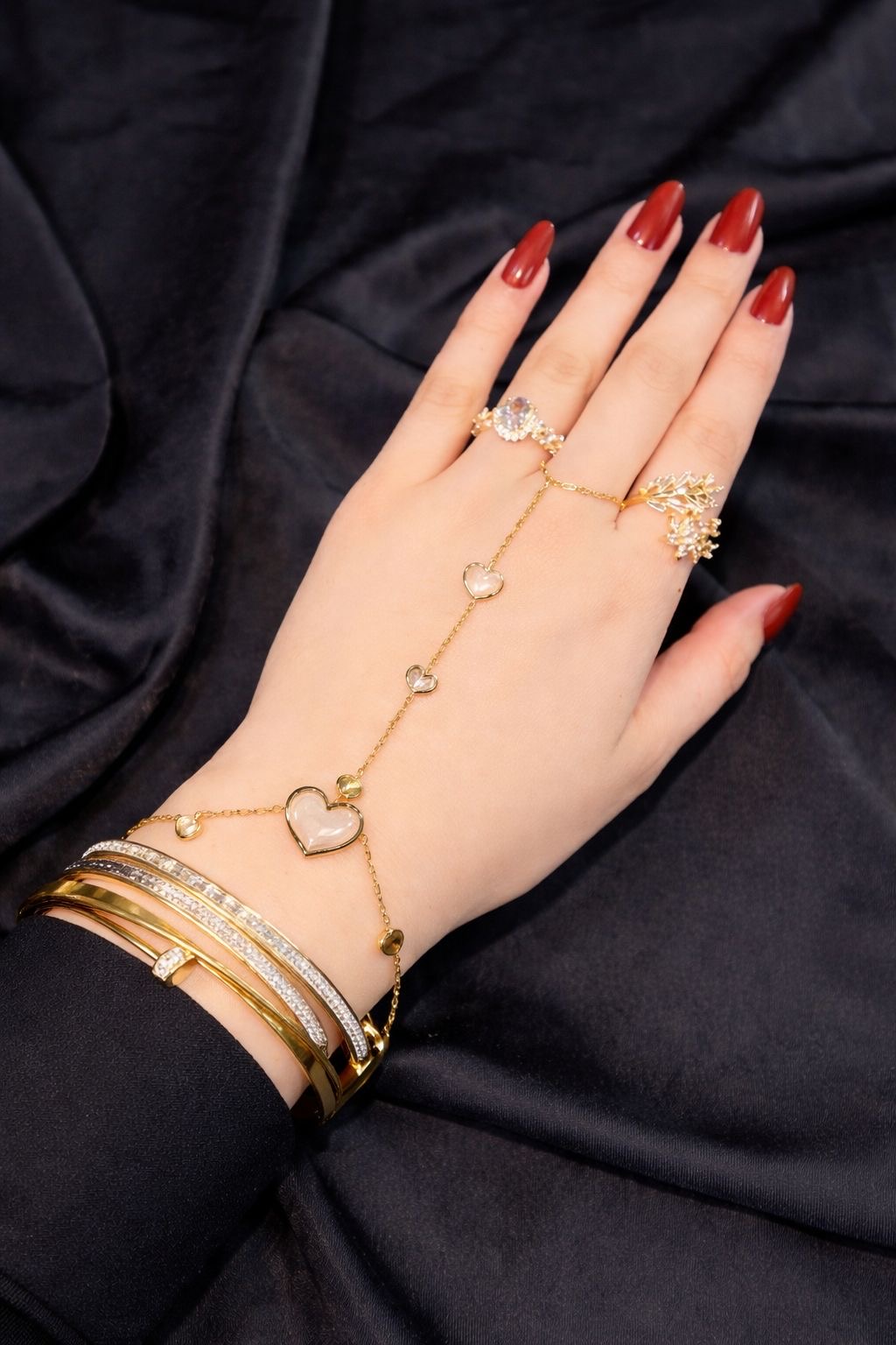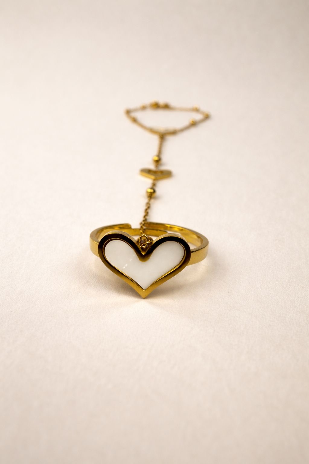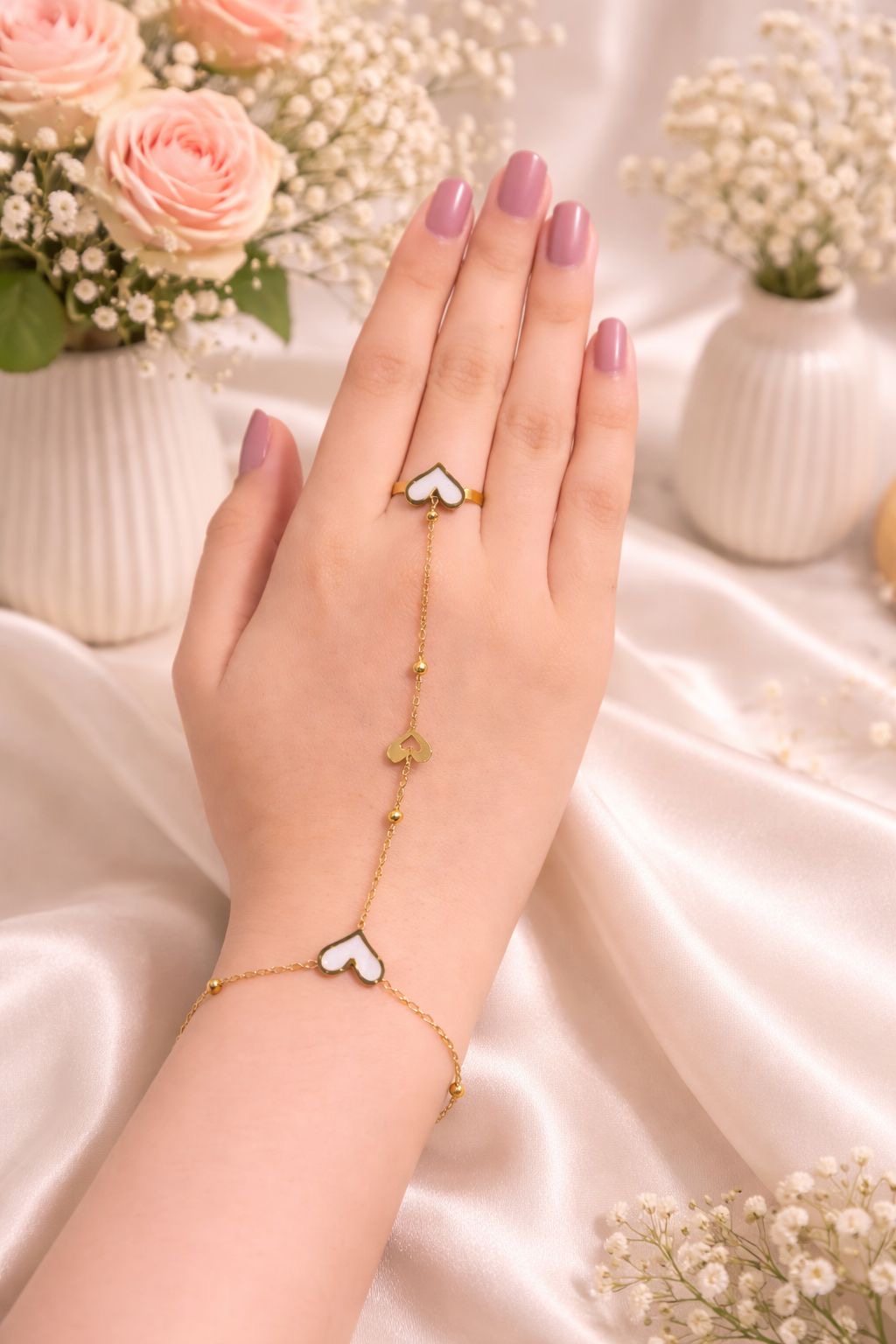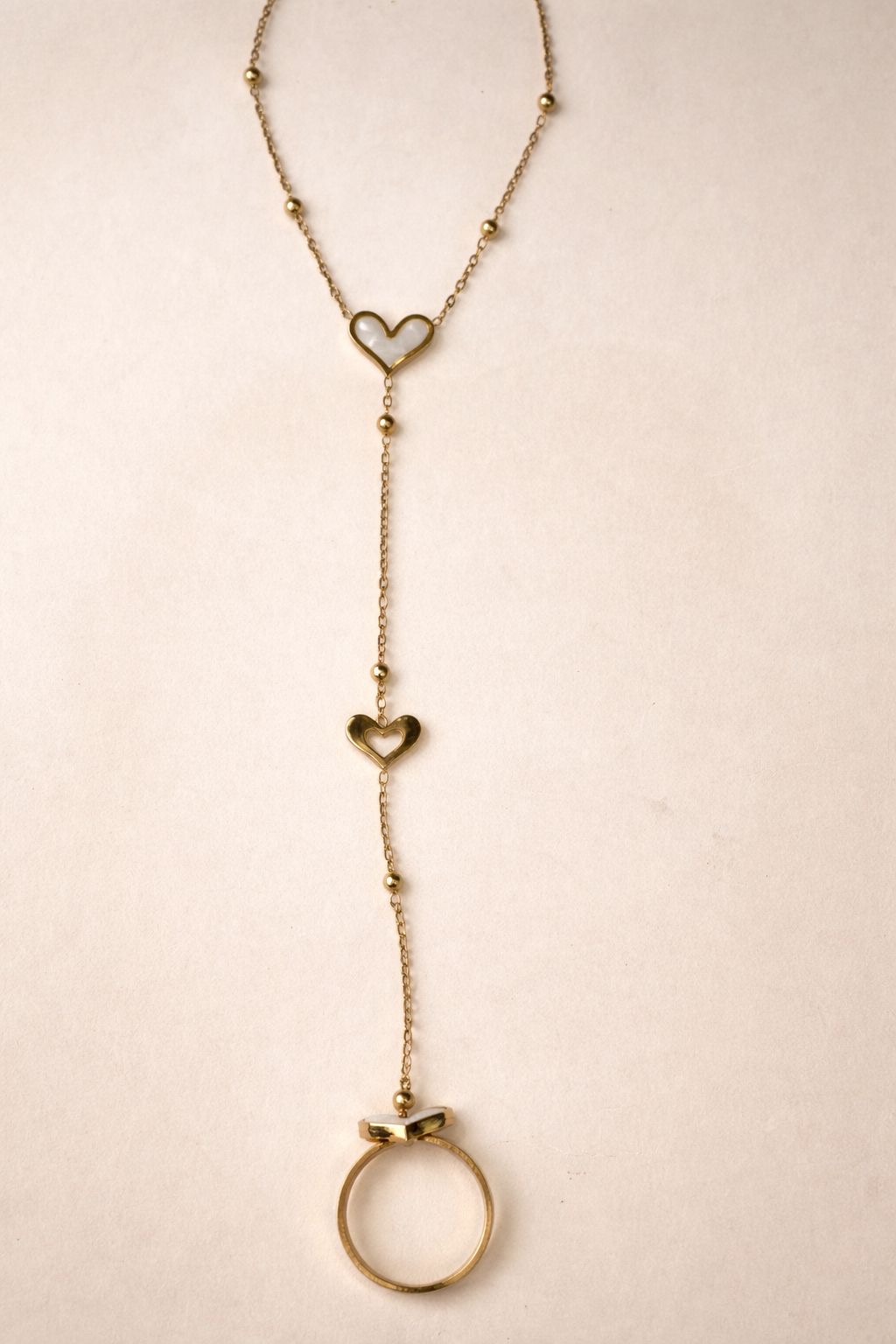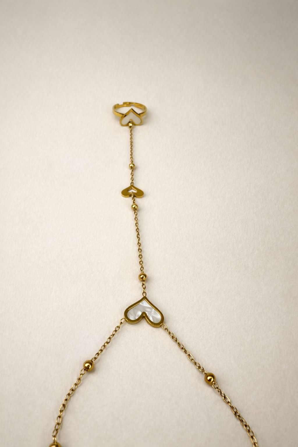 - Gold-toned hand harness. Fine chain with spherical bead details connecting a wrist bracelet to a finger ring. Features heart-shaped appliqués, including a central motif with a contrast mother-of-pearl effect inlay. Adjustable lobster clasp closure on the wrist and integrated ring.