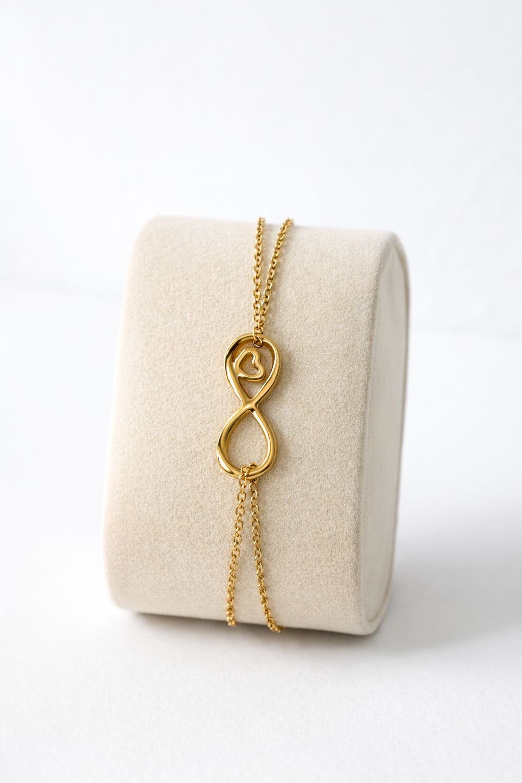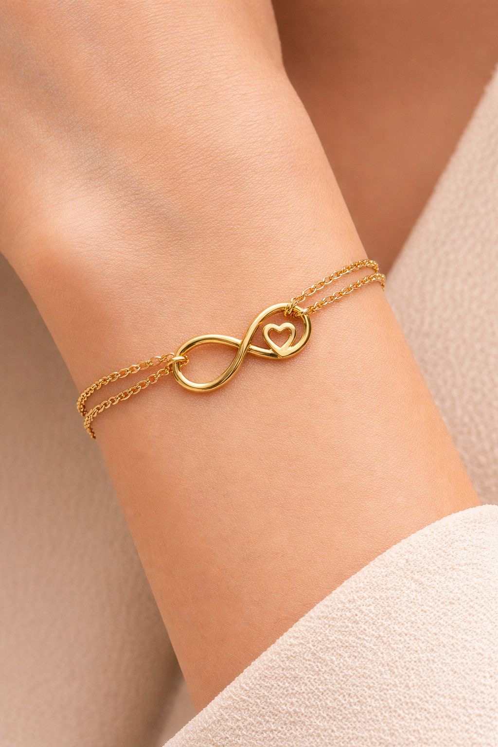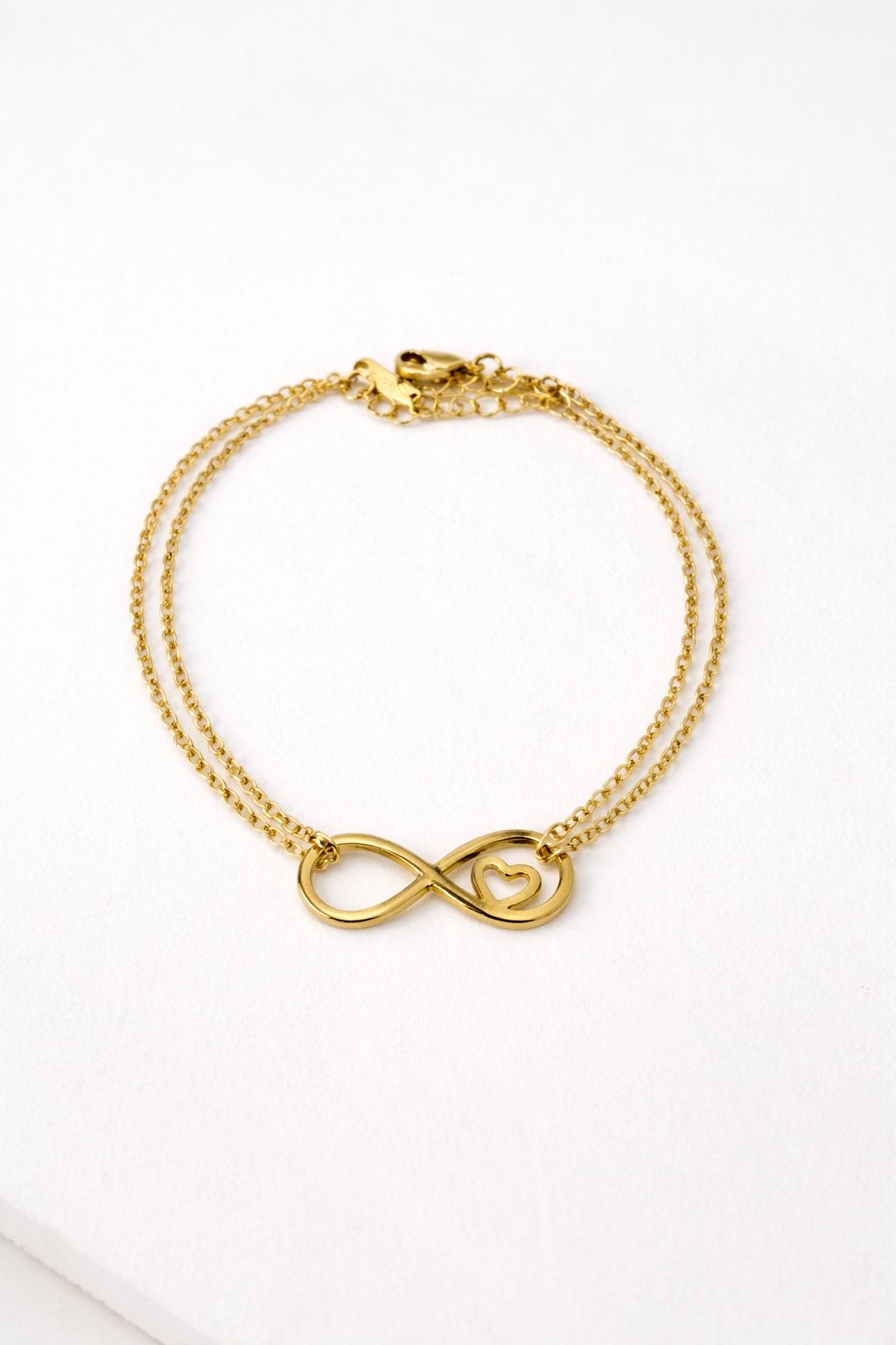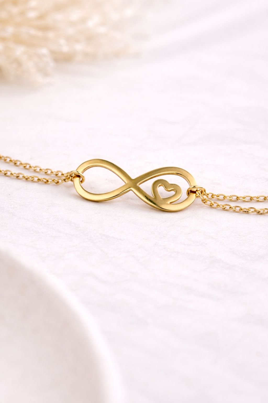 - Double-strand gold-toned chain bracelet. Features a central metallic appliqué in the shape of an infinity symbol with an integrated open-heart detail. Polished finish. Lobster clasp closure and adjustable length with extender chain.