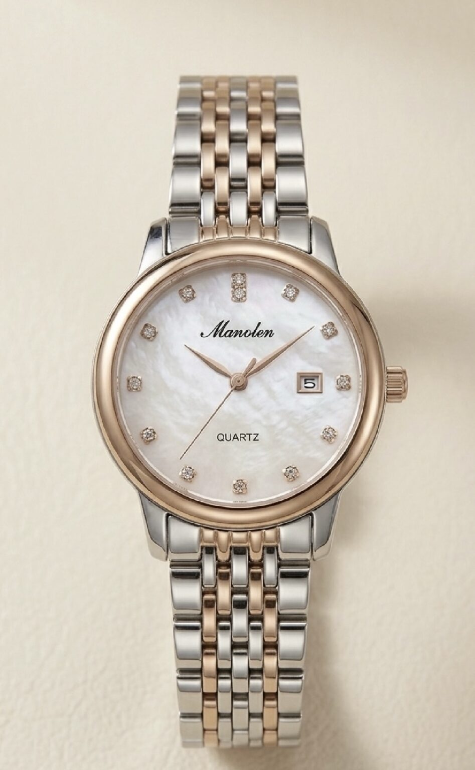 The Manolen Quartz Edition is a masterpiece of light and texture. It features a genuine mother-of-pearl dial that shifts in color with every movement, creating a unique, cloud-like glow. The hour markers are adorned with brilliant-cut crystals, adding a layer of sophisticated sparkle.
