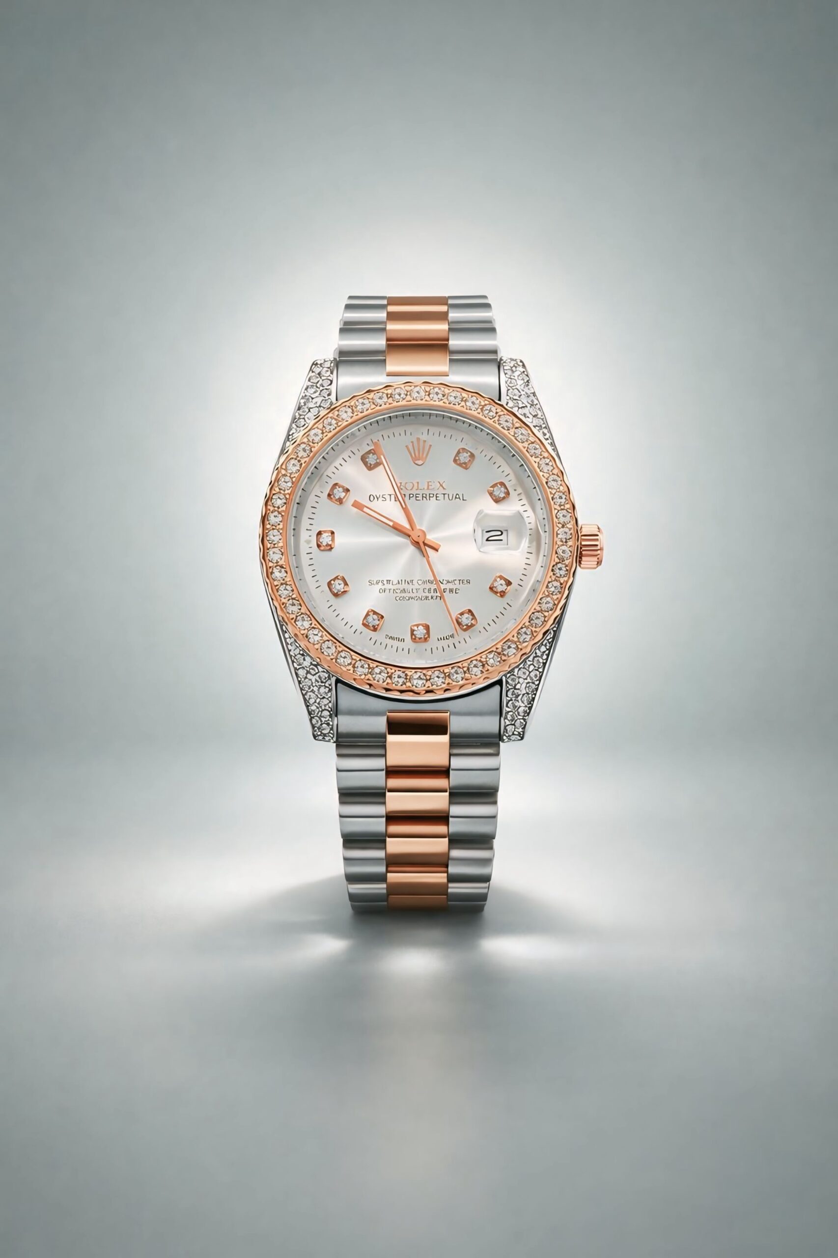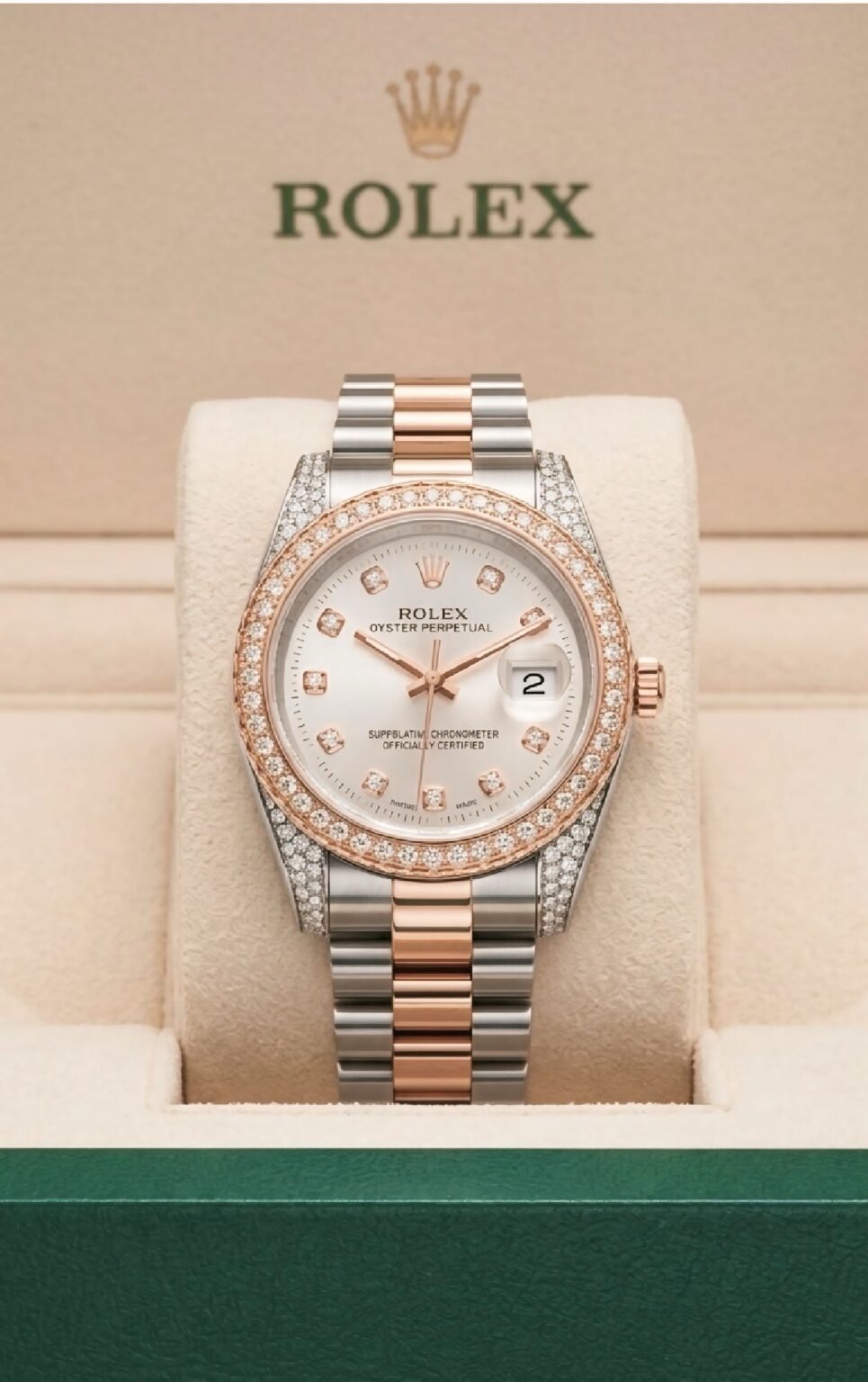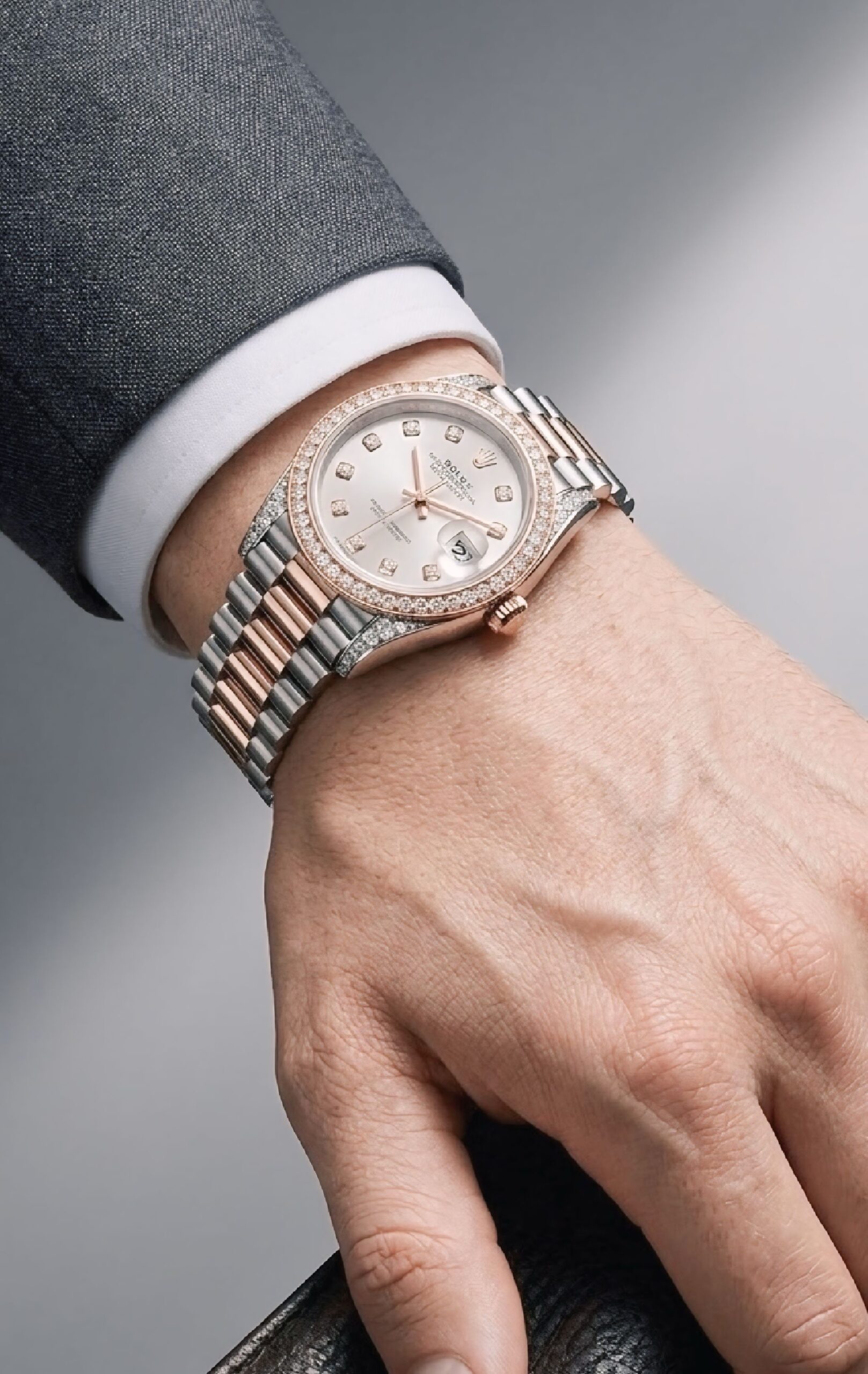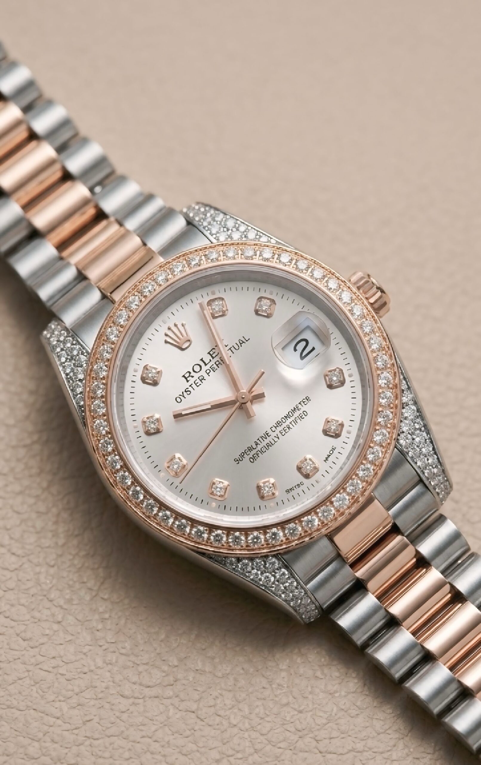 The Datejust 31 in Everose Rolesor—a marriage of Oystersteel and 18 ct Everose gold—is an exquisite expression of femininity and horological excellence. This model is defined by its masterful gem-setting, transforming a classic silhouette into a shimmering masterpiece