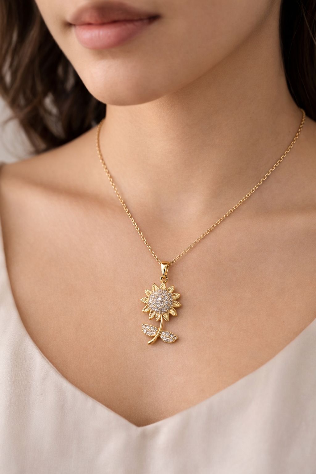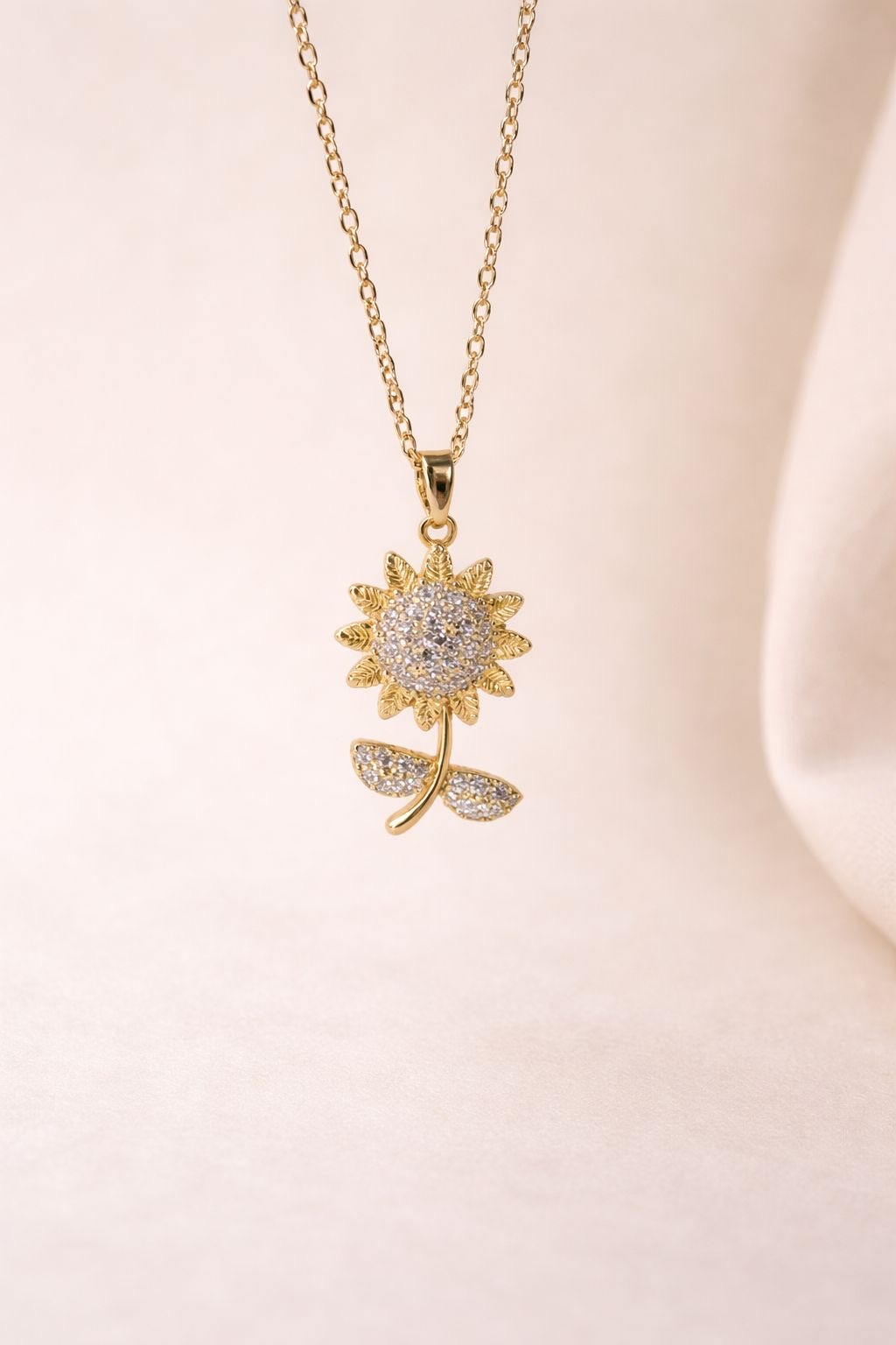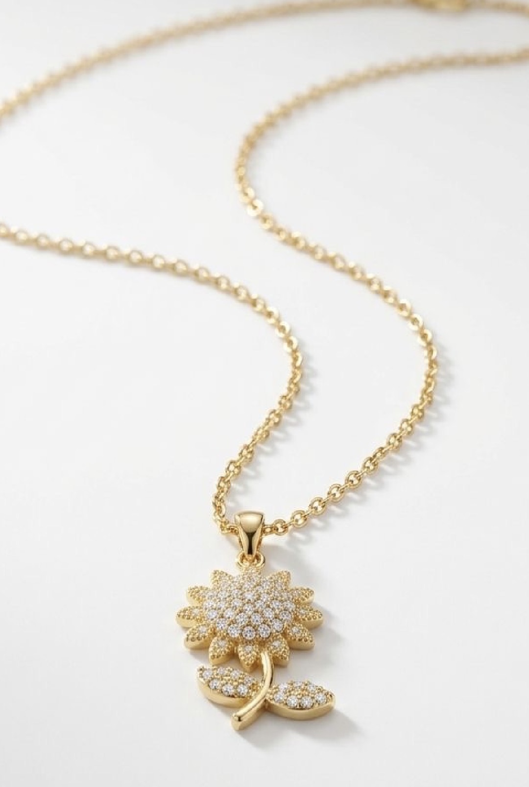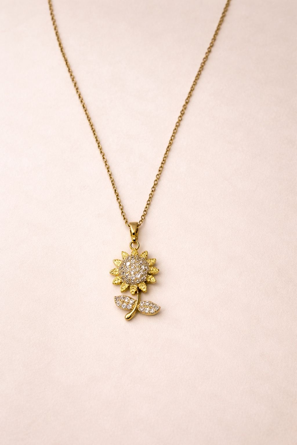 • Fine link chain featuring a central sunflower pendant. Textured petal detailing with a micro-pavé rhinestone core and leaf charms. Gold-toned metallic finish. Lobster clasp closure.